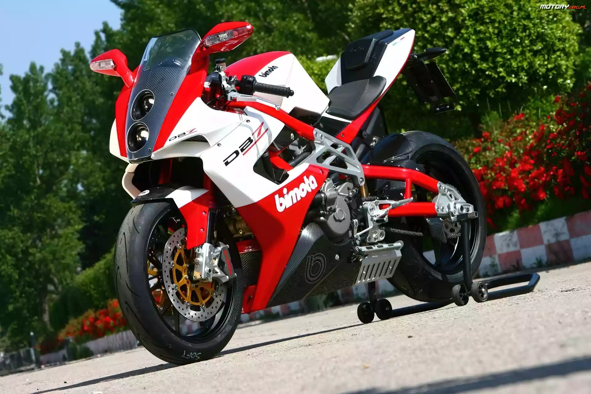 Bimbota DB7, Czerwono, Biały Opony, Bimota, Sportowe pokaz, wystawa tor, tył, kierowca, lewy Bimota db7, Nowy czerwono-biały, Motor koło, Łańcuch, tylne Wyścig, Motor, Tor Tarczowe, Bimota, Hamulce profil, Motor, lewy